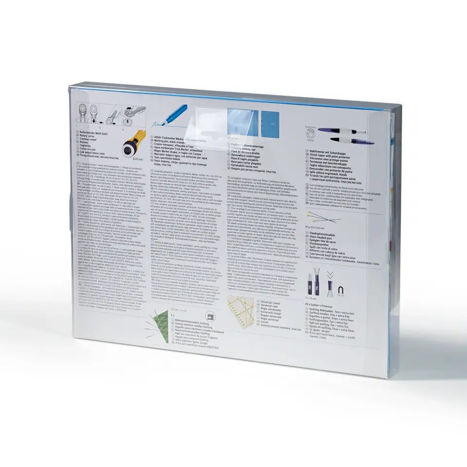 Mit dem Patchwork und Quilting Set hat man alles sofort zur Hand, was man für Patchwork- und Quiltarbeiten braucht. Angefangen bei der faltbaren Schneideunterlage, die durch ihre Klappmöglichkeit einfach zu transportieren ist, über den Rollschneider „Maxi Easy“ und die extra langen Glaskopfstecknadeln bis hin zum handlichen Omnigrid Lineal und einem Aqua Trickmarker ist hier alles enthalten, was ein gelungenes Set bieten sollte. Des Weiteren enthält das Patchwork und Quilting Set sortierte Quilt-Nähnadeln, einen kleinen Nahttrenner prym.ergonomics und außerdem eine Aufbewahrungsdose mit Nähmaschinennadeln „Quilting“.