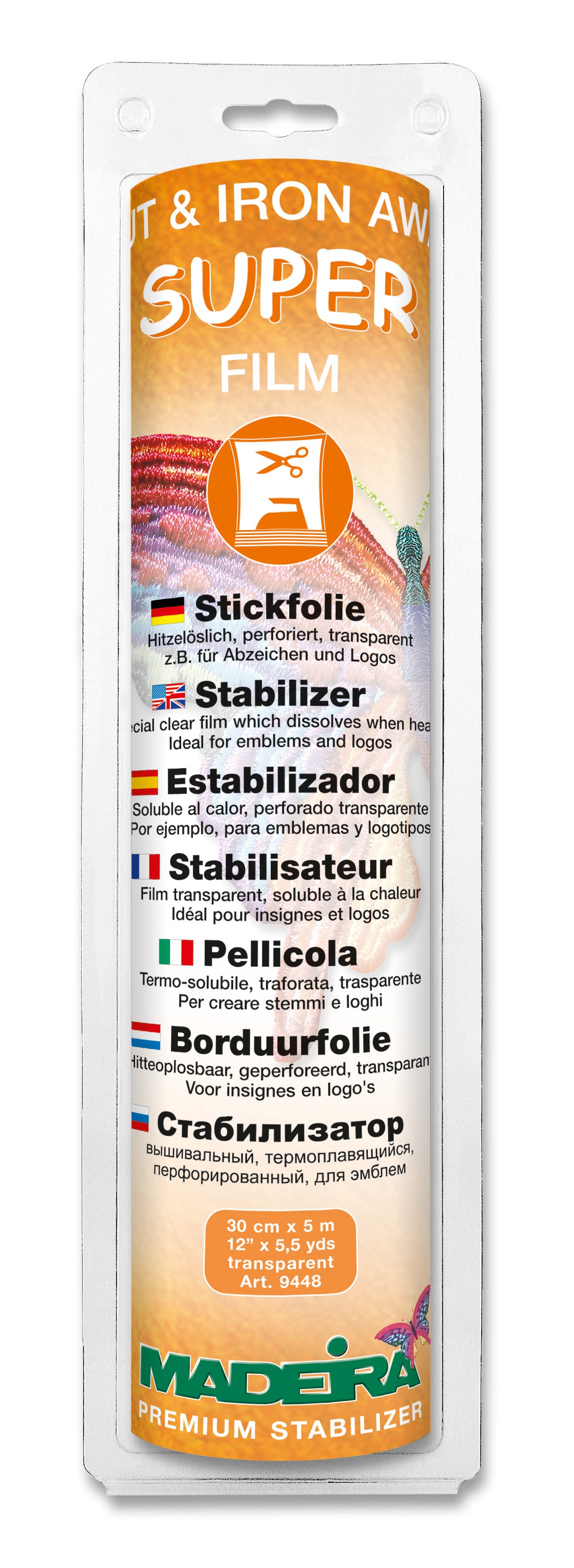 Perforiert und transparent, z.B. für wasserempfindliche Stoffe. Super Film ist eine hitzeempfindliche Spezialfolie, die sich durch heißes Bügeln auflöst. Super Film ist perforiert und dadurch hervorragend geeignet für Abzeichenstickerei, denn das Motiv lässt sich leicht und sauber ausreißen. Gegenüber wasserlöslichen Folien hat Super Film den Vorteil, dass auch wasserempfindliche Stoffe (z.B. Samt, Cord) verarbeitet werden können.