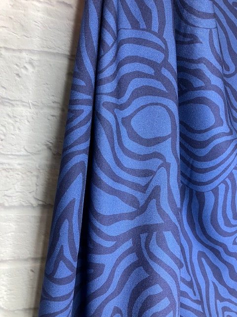 Viskose-Webware Midnight Flow zeigt ein faszinierendes, abstraktes Muster in verschiedenen Blautönen – wie fließende Linien, die sich organisch über den Stoff ziehen. Die Wirkung ist modern, ruhig und dennoch dynamisch – ideal für stilvolle, außergewöhnliche Nähprojekte.